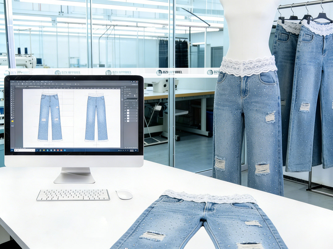 Our service starts with thorough, patient communication to lock in every design detail. For women’s lace-waist rhinestone ripped jeans, we discuss denim fabric weight, lace trim material, rhinestone specification, ripped hole position and waist stitching details.