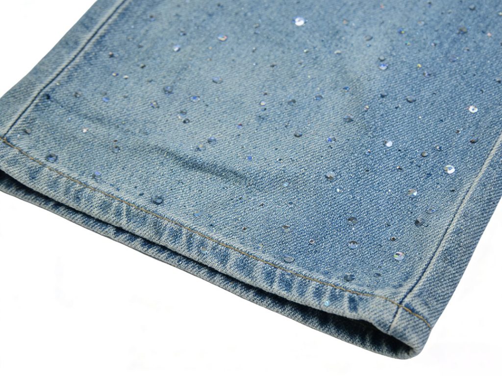 We support full customization across every production element: 10-14oz stretch or non-stretch denim fabric, vintage or light wash effects, soft lace waist trim, firm rhinestone setting and neat ripped edge finishing.