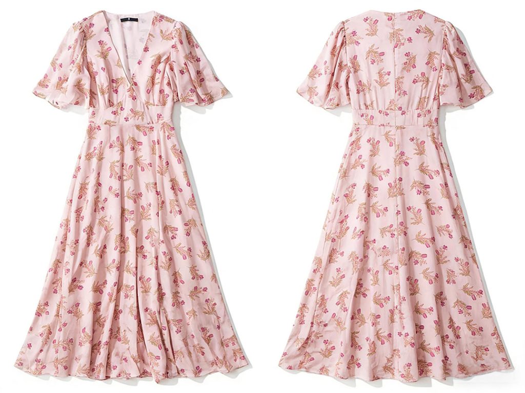 Our signature floral wrap dress features a classic surplice V-neckline, a timeless French tea dress design. The V-neck flatters neck lines and elongates facial proportions, a key detail for women’s apparel.