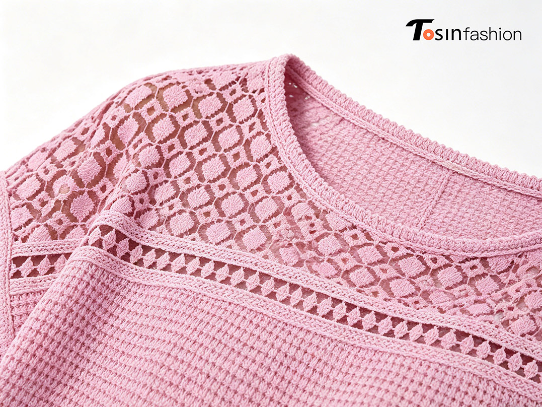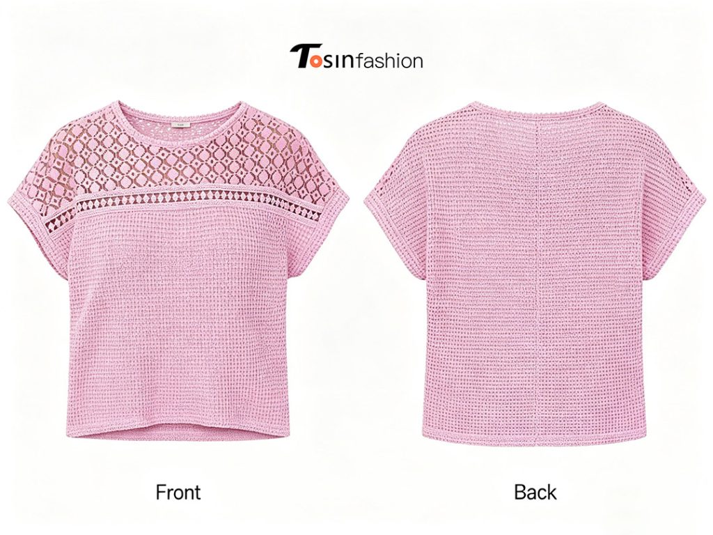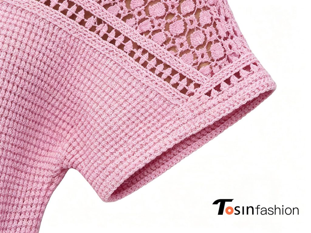 A reasonable design layout can greatly improve production efficiency and finished product effect. Our featured mixed knit and crochet short-sleeve top is a popular summer piece. It combines diamond openwork crochet and waffle knit textures.