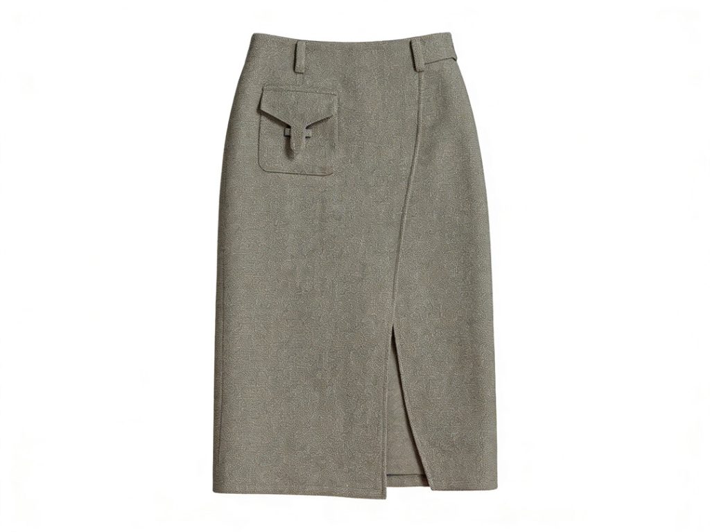 Our featured oat-colored wrap slit straight midi skirt is a versatile staple for professional wardrobes. The midi length hits just below the knee, and the straight silhouette offers strong tolerance for waist, hips and leg shapes, creating a slimming effect for all body types.